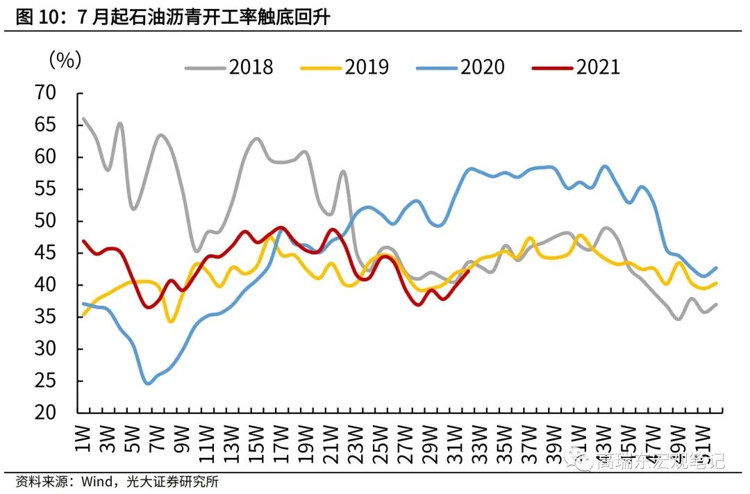 石油沥青下游约有80%用于道路投资,而道路投资在基建投资中占比26%,是监测基建投资的重要指标。7月以来石油沥青装置开工率提升,指向道路投资在逐步改善。
