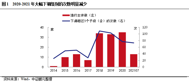 此外,我们观察到,2018-2020年均有违约当日才进行首次级别下调的情况,造成级别断崖式下降。其中,2018年有5家,2019年和2020年各1家,在2021年截至目前尚未发生。这也反映出,评级机构也在不断地调整评级机制,避免这种毫无预警的断崖式下调。