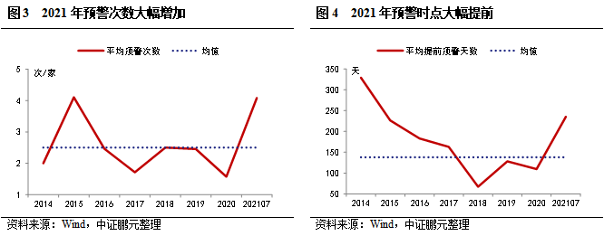 第二,预警次数显著增加,预警时间大幅提前。2014年以来,预警次数方面,我国评级机构对事后违约主体的平均预警次数为2.5次/家,而2021年截至目前是平均预警4.1次/家,预警次数大幅增加。预警天数方面,2018年平均提前预警天数为历史最低点67.1天,随后几年均在100天以上,2021年截至目前是平均提前235天进行预警,预警时点大幅提前。