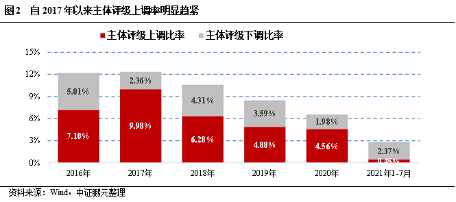 同时,我国评级机构在上调级别方面已趋于谨慎。2016-2021年级别调整率表明,自2017年以来我国发债主体的评级上调率已明显下降,2021年截至目前更是低至0.45%(图2)。2018-2021年的上调/下调比率也从2018年的1.46下降至2021年的0.19,整体呈下降趋势。