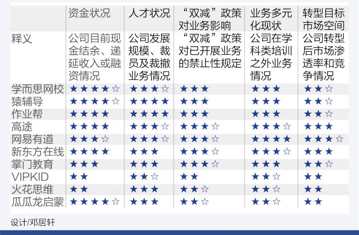21世纪经济研究院根据RCSP范式设置K12在线教育公司转型的若干指标,以星级形式对目前头部公司的转型竞争力进行了评估。