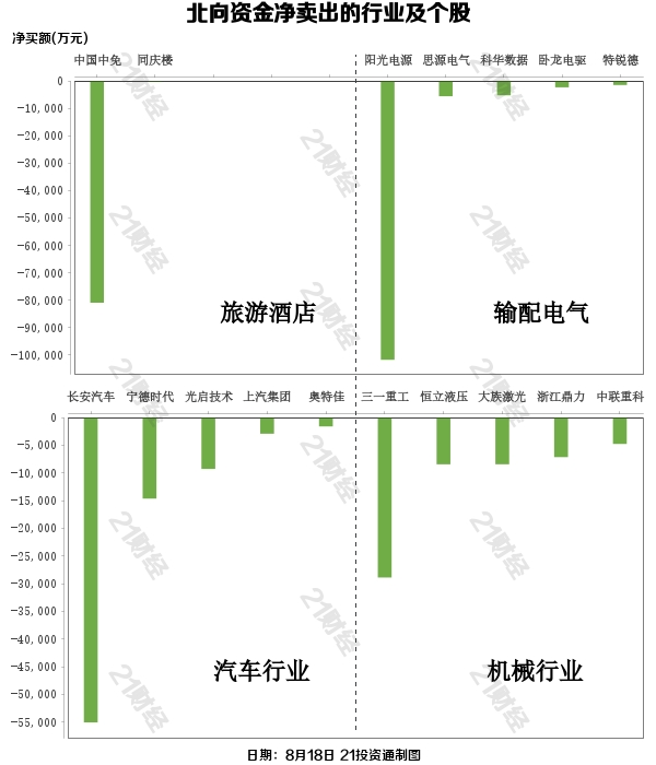 北向资金减持了25个行业,其中旅游酒店最多,净卖出金额达6.85亿元,其次是输配电气行业,净卖出6.40亿元。