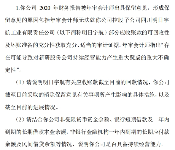 深交所要求新研股份说明明日宇航有关应收账款截至目前的回款情况,以及结合公司非受限货币资金余额、银行短期借款及一年内到期的长期借款本金余额,非银行金融机构一年内到期的长期应付款余额及民间借贷余额等情况,说明公司是否具备持续经营能力。