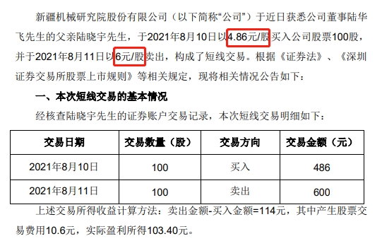 新研股份公告也表示,陆晓宇的交易“主要出于对二级市场价格波动的投资判断,并不知情和利用任何定期报告及业绩信息”,但其因不了解相关法律、法规的规定而误操作,相关短线交易不存在因获悉内幕信息而谋求利益的情形,亦不存在利用短线交易谋求利益的目的。