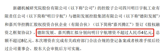 7月7日,新研股份公告称,德阳发展、嘉兴腾汇(新研股份控股股东)拟分别向明日宇航增资不超过4亿元,总额不超过8亿元。