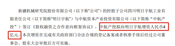 8月12日,新研股份再次发布公告,中航产投拟向明日宇航增资4亿元。而且,此次增资事项与上述的增资构成同一事项,即为中航产投拟与德阳发展、嘉兴腾汇共同对明日宇航进行股权投资。