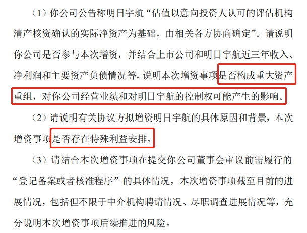 深交所在最新关注函中还进一步追问,此次有关协议方拟增资明日宇航的具体原因和背景,本次增资事项是否存在特殊利益安排。