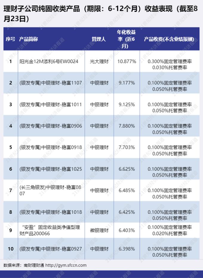 【理财风云榜】理财子6-12个月纯固收类产品表现(截至8月23日)
