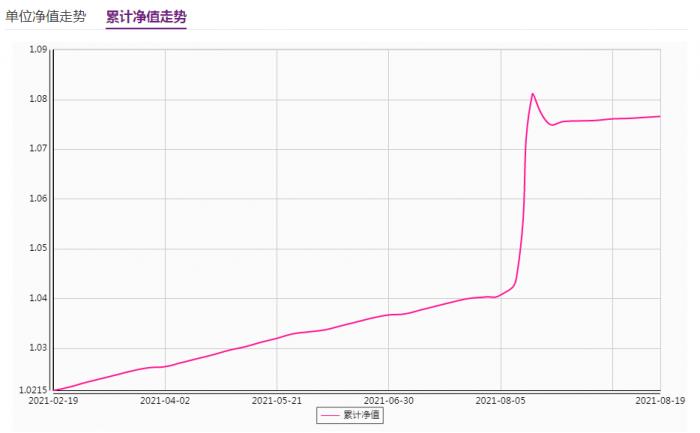 从近6个月累计净值走势来看,截至8月19日,该产品最新累计净值为1.0766,2月19日累计净值为1.0215,近6个月净值增长率5.439%。