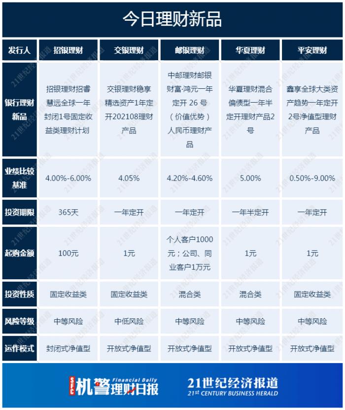 《机警理财日报》是南财理财通、21世纪经济报道旗下投资理财专栏,旨在帮投资者守好“钱袋子”。课题报道组长期关注银行理财,并搭建独有理财数据库,欢迎申请试用。本专栏每日内容各有侧重,周一聚焦固收+产品、周二纯固收产品、周三现金管理类产品、周四混合类产品、周五权益类产品,每周一至周五更新,移动端内容尽在21财经APP,平面内容尽在《21世纪经济报道》报纸【南财理财通】专栏,敬请关注!