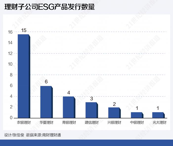 理财子公司方面,截至2021年8月12日,7家理财子公司合计发行ESG主题产品32只,发行数量排名前3的为农银理财、华夏理财和青银理财,发行数量分别为15只、6只和4只。