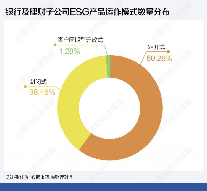 据南财理财通数据,目前银行及理财子公司ESG产品的运作模式主要为开放式净值型。截至2021年8月12日,在银行及理财子公司发行的78只ESG产品中,开放式产品有48只,占比61.54%;封闭式产品有30只,占比38.46%。
