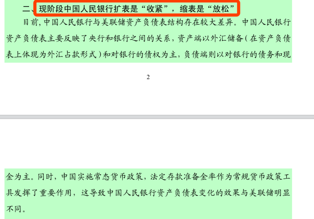 所以正如央行2019年三季度货币执行情况报告里讲到的,美联储扩表是放松,缩表是收紧。但是现阶段央行扩表是“收紧”,缩表是“放松”。
