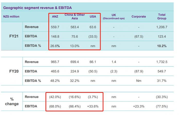 具体到各个主要区域,其中澳新市场录得收入5.59亿新西兰元,同比下滑42%,息税折旧及摊销前利润1.49亿新西兰元,同比下滑68%;中国及其他亚洲市场营收5.83亿新西兰元,同比下滑16.6%,EBITDA为0.76亿新西兰元,同比下滑66.4%;美国市场营收0.64亿新西兰元,同比下滑3.7%,EBITDA为-0.34亿新西兰元。