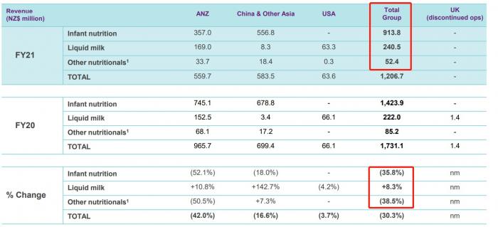 按业务划分,2021财年婴儿营养品总营收9.14亿新西兰元,同比下滑35.8%;鲜奶总营收2.41亿新西兰元,同比增长8.3%;其他营养品总营收0.52亿新西兰元,同比下滑38.5%。