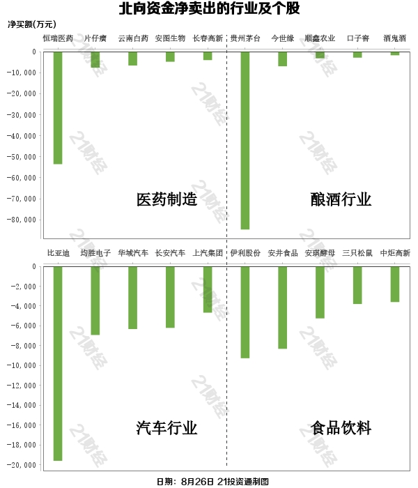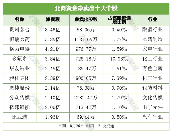 其中,贵州茅台被净卖出8.46亿元,恒瑞医药被净卖出5.35亿元,格力电器被净卖出4.21亿元,多氟多被净卖出3.84亿元,华友钴业被净卖出2.45亿元。
