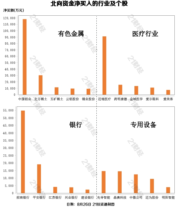 其中,中国铝业被净买入11.81亿元,迈瑞医疗被净买入9.12亿元,招商银行被净买入5.48亿元,合盛硅业被净买入5.32亿元,京运通被净买入4.34亿元。