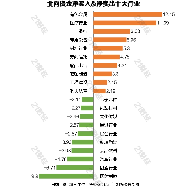 从净买入金额来看,北向资金增持了27个行业,其中有色金属居首,净买入金额达12.45亿元,其次是医疗行业,净买入11.39亿元。