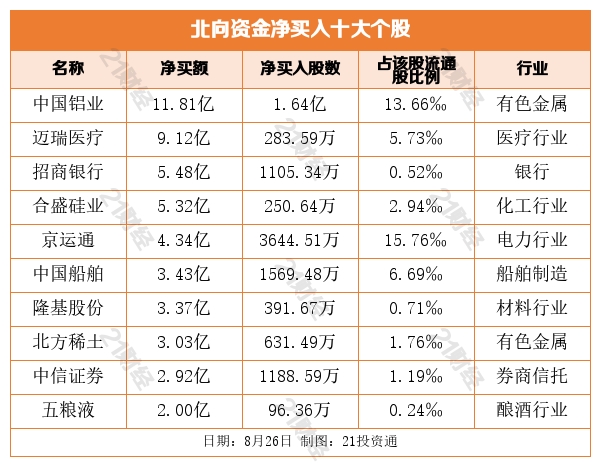 净买入中国铝业11.81亿元,净卖出贵州茅台8.46亿元