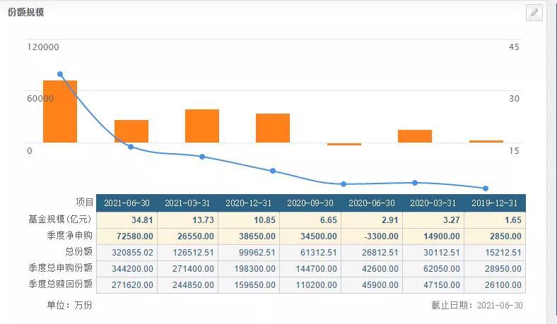 接下来,我们再来看一下这只基金的规模变化:下图是这只基金自2019年12月底年报以来的规模情况,可以看到2019年12月31日是1.52亿份,当季净申购2850万份,也就是说2019年9月30日其份额大约是1.24亿份。随着白酒板块的快速上涨,该基金的份额从2020年1季度开始快速上涨,截至2021年6月30日,其份额高达32.08亿份。不到两年的时间里,其份额从1.24亿份增长到32.08亿份,增长25倍,这样的增长幅度可谓十分惊人。