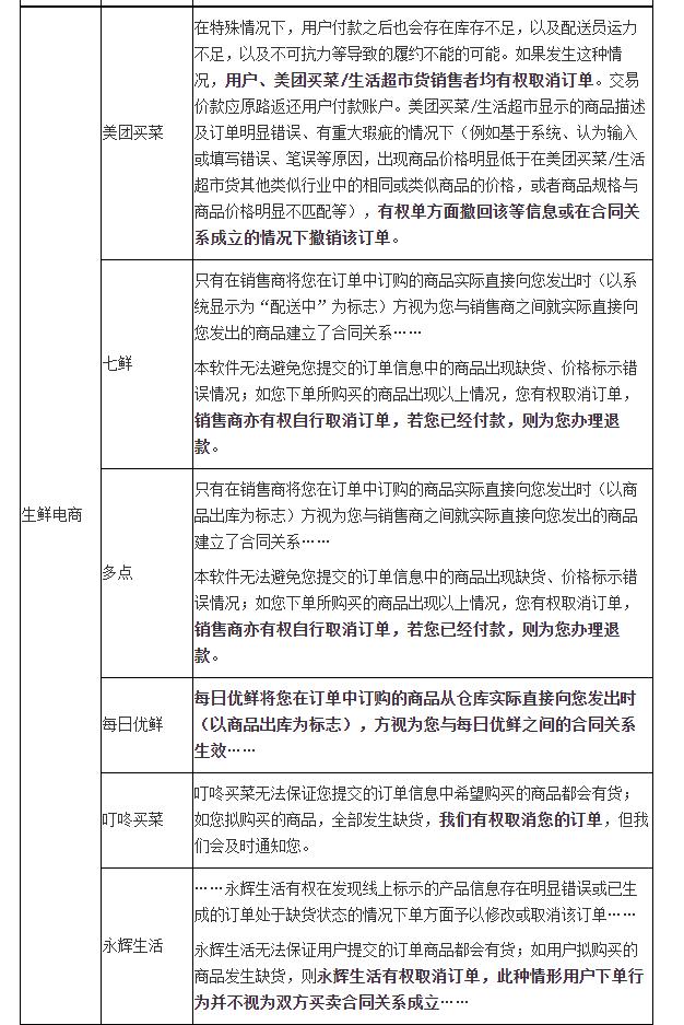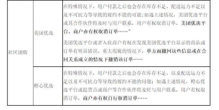 其中,每日优鲜、多点、京东、1号会员店4个平台规定,只有商品从仓库实际发出,方视为与消费者建立了合同关系,涉嫌违反《电子商务法》有关合同成立规定;真快乐、云集、七鲜、亚马逊、多点、京东、1号会员店、小米有品、华为商城、永乐票务、票牛、美团买菜、叮咚买菜、永辉生活、美团优选以及橙心优选16个平台规定,商品缺货、标错价格等情况有权取消订单,涉嫌通过格式条款减轻或免除自身责任。