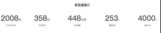 公司官网显示,茶百道成立于2008年,2010年开始推出茶百道奶茶,比喜茶早2年,定位鲜果与中国茶,目标人群与奈雪的茶类似,主攻年轻女性,目前加盟店总数超过4000家,年营业额358亿元。