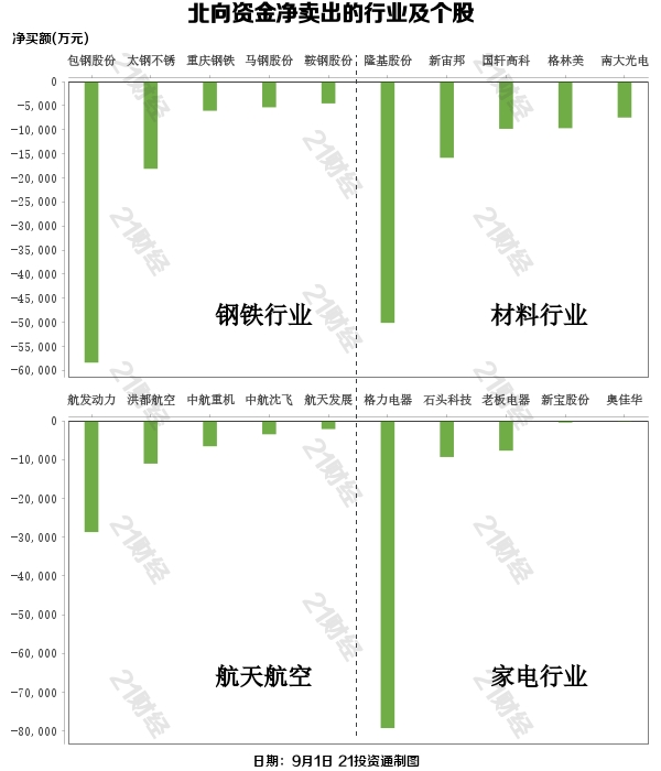 北向资金减持了16个行业,其中钢铁行业最多,净卖出金额达8.73亿元,其次是材料行业,净卖出5.68亿元。