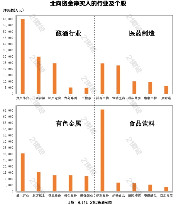 从净买入金额来看,北向资金增持了43个行业,其中酿酒行业居首,净买入金额达12.03亿元,其次是医药制造行业,净买入9.84亿元。
