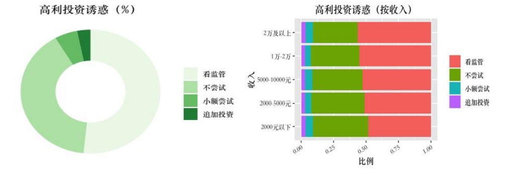 在应对高利诱惑方面,整体上,在互联网渠道遇到高利诱惑时,通过互联网渠道获取金融产品或服务信息的群体中,51.60%的受访者会先查看对方是否受监管,40.04%会看产品内容,但不会尝试,5.26%可能受到高利诱惑而进行小额尝试,3.10%会小额尝试并可能会追加投资。