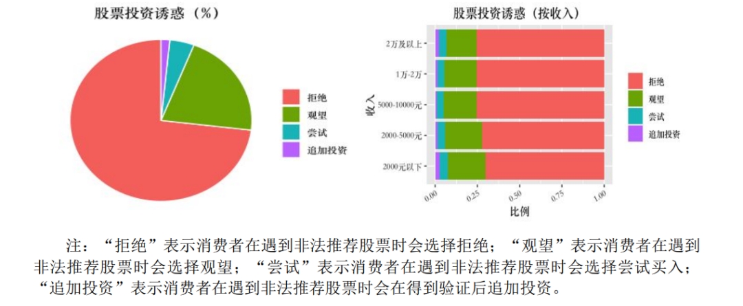 在应对非法股票投资诱惑方面,在互联网渠道遇上非法股票投资诱惑时,多数消费者会予以明确的拒绝,也有部分受访者会有观望或尝试的心态。73.09%的受访者会予以明确的拒绝,21.01%的受访者会进入聊天群观望,4.35%的受访者会考虑尝试,1.56%的受访者会先行尝试,并考虑追加投资。