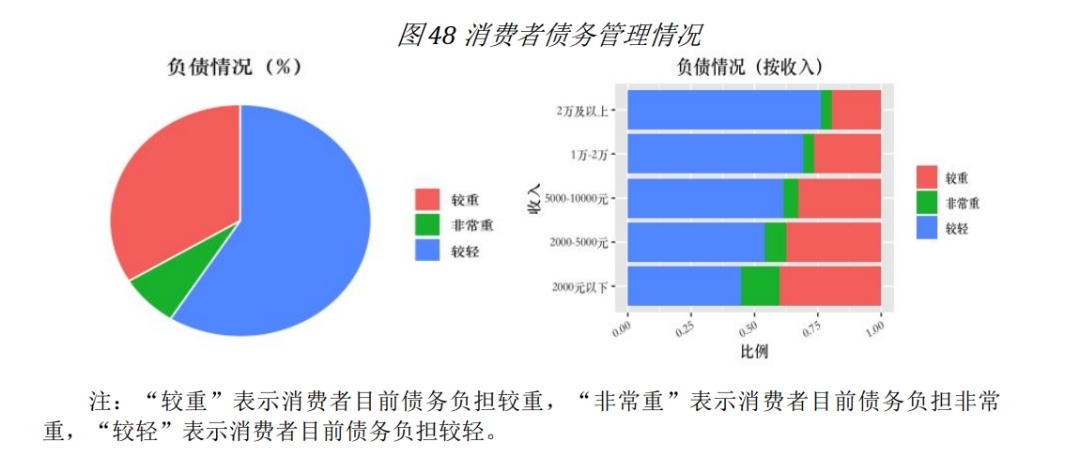 从收入维度看,2万及以上月收入段中,76.3%的受访者表示目前债务负担较轻,月收入1万-2万的受访者中比例为69.22%,月收入5000到1万的受访者中比例为61.45%,月收入2000到5000元的受访者中比例为54.09%,月收入2000元以下的受访者中比例为44.53%。