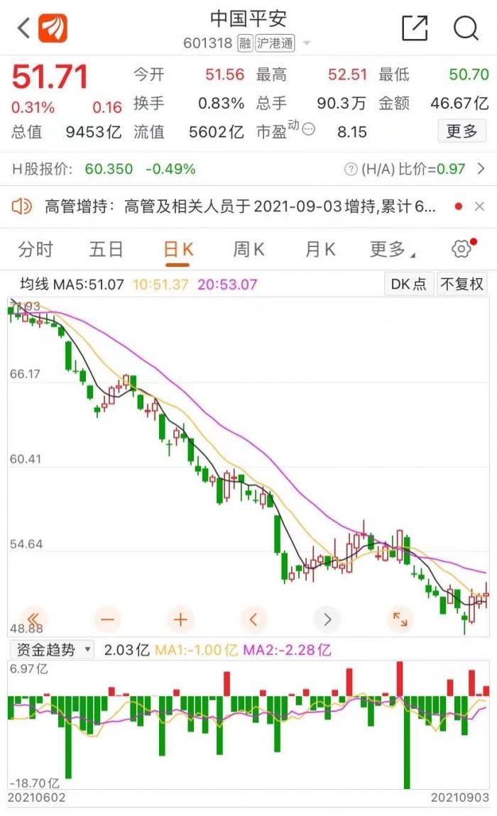 与此同时,中国平安宣布拟使用自有资金实施50-100亿元A股股份回购,回购价格不超过82.56元/股。截至9月3日,中国平安已经连续6个交易日回购,其中平安董事长马明哲也出手了,一共回购5490.0574万A股股份,共耗资27.68亿元。