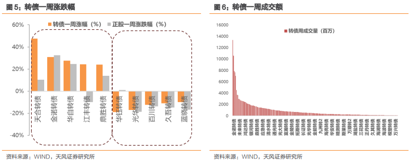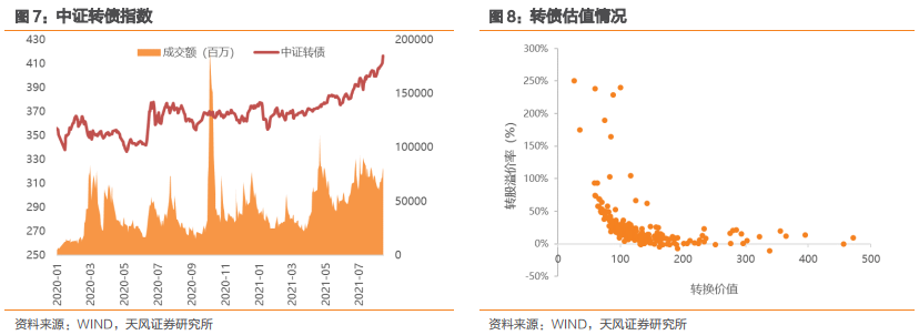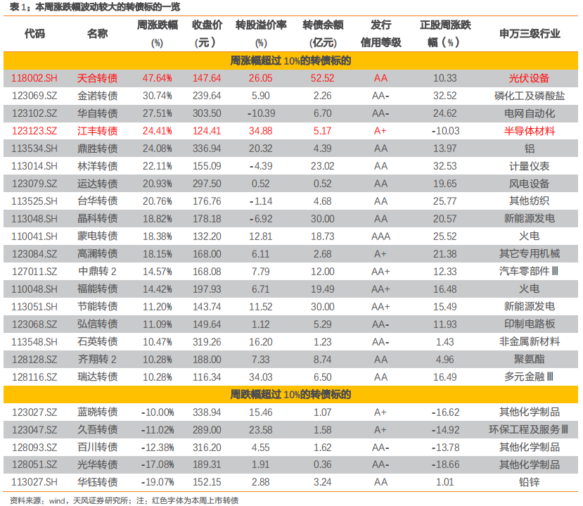 从个券看,本周电力板块表现较为突出,涨幅超过10%的18只转债中,有8只标的与电力板块相关(天合、华自、林洋、运达、晶科、蒙电、福能、节能),与此同时,半导体、新能源等前期热门板块表现依旧较好。新券方面,本周新上市的天合转债和江丰转债均涨停开盘,最终均大幅收涨,这或许一定程度上得益于标的所处产业链景气度较高,同时,固收+基金发行较为火热,市场资金对于转债的配置需求仍然较高也有一定影响。