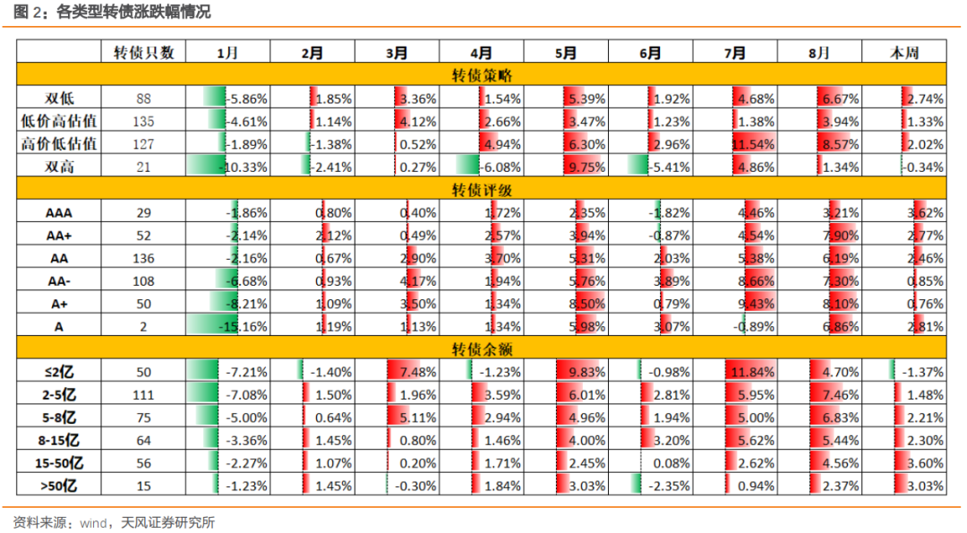 结构角度,低估值策略持续占优。7月份以来,无论是双低转债(转债价格不超过120元,转股溢价率不超过30%)还是高价低估值策略均明显跑赢高估值转债,一定程度上反映出在转债市场整体估值不断抬升的情况下,标的的安全性仍是投资者投资的重要考量因素之一。从转债发行评级角度,中低评级转债在7、8月份亦有不错的表现,7、8月份月涨幅均超过10%的33只标的中,有16只发行评级为AA-及以下,由此可见在上升行情中适度下沉择券或许也是相对不错的选择。