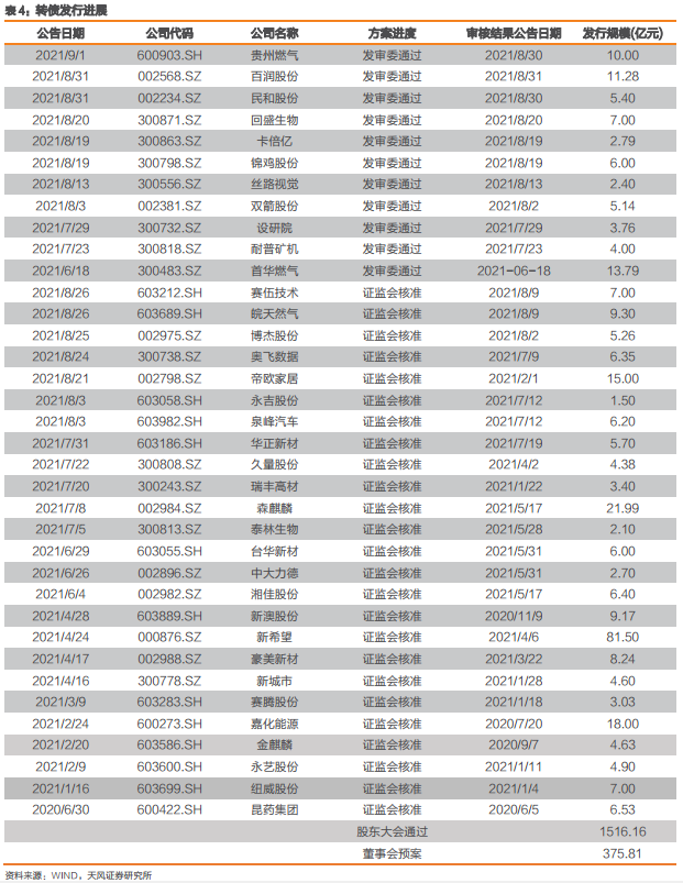 一级市场审批节奏一般。中国银河(110.00)、华锐精密(4.00)、微芯生物(5.00)公开发行可转债预案获董事会通过;常熟银行(60.00)、药石科技(11.50)、永创智能(6.11)、天奈科技(8.30)、中辰股份(5.71)预案获得股东大会通过;药石科技(11.50)获得深交所受理;绿色动力(23.90)、精工钢构(20.00)获得证监会受理;民和股份(5.40)、百润股份(11.28)、贵州燃气(10.00)获得发审委通过;元力转债(9.00)公告发行。