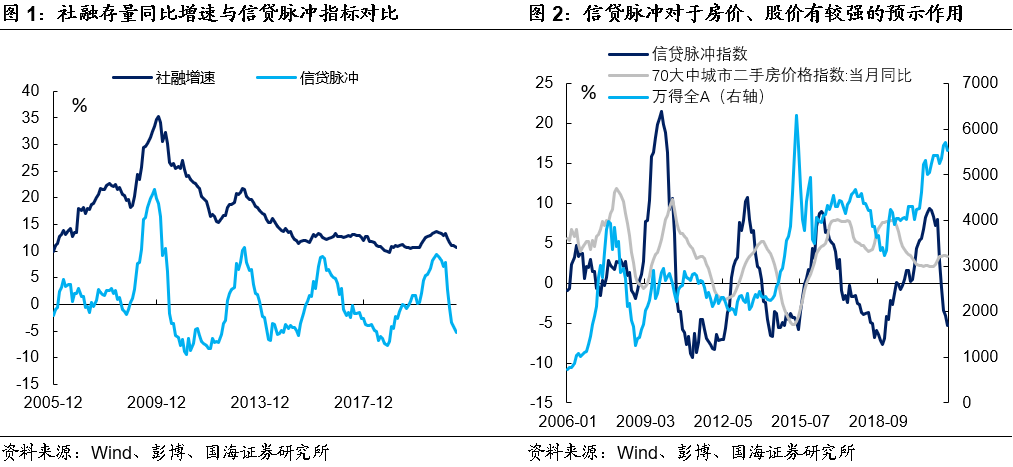 与社融同比增速相比,信贷脉冲指标相当于社融同比的一阶变化,更能反映出社融的边际增减;且经过GDP标准化后,周期性更加明显,有助于减少周期错判。从历史上看,2017年之前信贷脉冲指标对于中国房价有较强的预示作用,2017年之后对股价有较强的预示作用,反映出该指标作为信用指标的有效性。