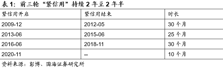 参考前三轮“紧信用”的周期时长,当前“紧信用”阶段可能才行至中途。自2009年以来,中国共经历了4轮“紧信用”周期(根据信贷脉冲指标划分),目前正在经历第四轮。且从前三轮“紧信用”周期的时长来看,紧信用阶段一般持续2年至2年半,而从去年11月份开始的当前一轮“紧信用”,才刚刚度过三个季度。从这一角度看,当前的“紧信用”可能只是行至中途。