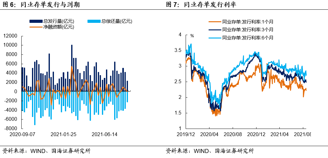 同业存单各期限发行利率涨跌分化。9月3日,1月期品种发行利率为2.2875%,较上周五下行7.40BP;3月期品种利率为2.5239%,下行0.09BP;6月期品种发行利率为2.8012%,上行5.57BP。