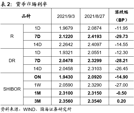 跨月后资金利率全面下行。9月3日,相较于上周五(8月27日,下同),银行间质押式回购利率方面,R001下行11.95BP,R007下行29.73BP,R014下行14.55BP。存款类质押式回购利率方面,DR001下行12.30BP,DR007下行28.21BP,DR014下行26.45BP。