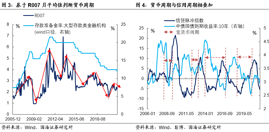 除了信用周期以外,另一个影响债市的因素为货币政策或货币周期。我们以“R007月平均值”中枢的增减,判断历史上的货币周期。金融危机以来共出现过4轮“宽货币+宽信用”相叠加的阶段。它们分别为2009年上半年、2012年下半年、2015年半年-2016年上半年、2019年-2020年上半年。