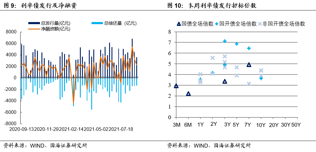 本周利率债净融资额较上周减少。本周一级市场共发行56支利率债,实际发行总额为3602.47亿元,较上周减少929.46亿元;总偿还量为1334.57亿元,较上周减少36.28亿元;净融资额为2267.90亿元,净融资较上周减少893.17亿元。