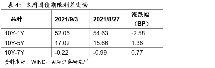 各期限利差涨跌分化。9月3日,与上周五相比,10Y-1Y利差下行2.58BP,10Y-5Y利差上行1.36BP,10Y-7Y利差上行0.77BP。