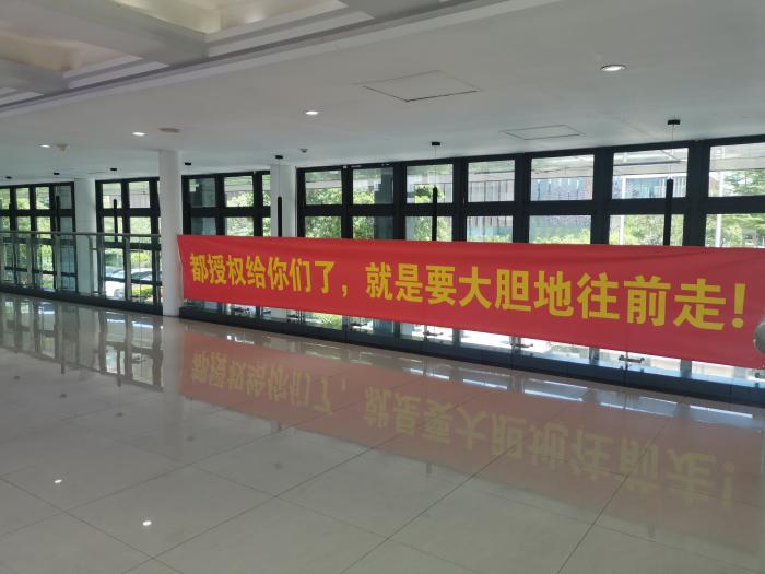 (在前海管理局办公楼里,鲜明的标语彰显着改革创新的决心。 李婷菊/摄影)