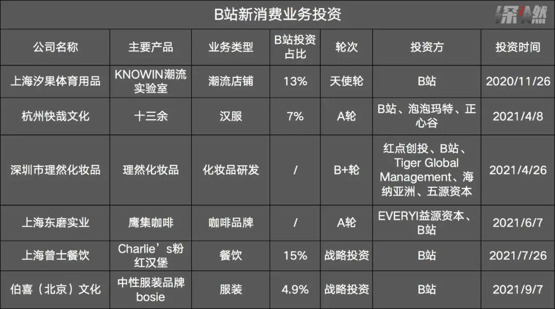 2021年至今,B站投资了汉服品牌“十三余”、化妆品研发商“理然”、鹰集咖啡母公司“东磨实业”、Charlie’s粉红汉堡品牌母公司“曾士餐饮”、时装品牌bosie母公司“伯喜文化”。2020年年末,B站还投资了KNOWIN潮流实验室母公司“汐果体育”。其中,B站在曾士餐饮持股近15%,在汐果体育占股13%,在十三余占股7%,在伯喜文化占股4.9%,另外两家持股较少。