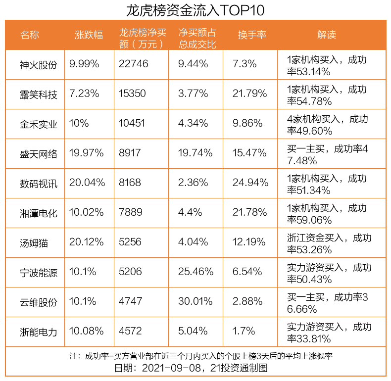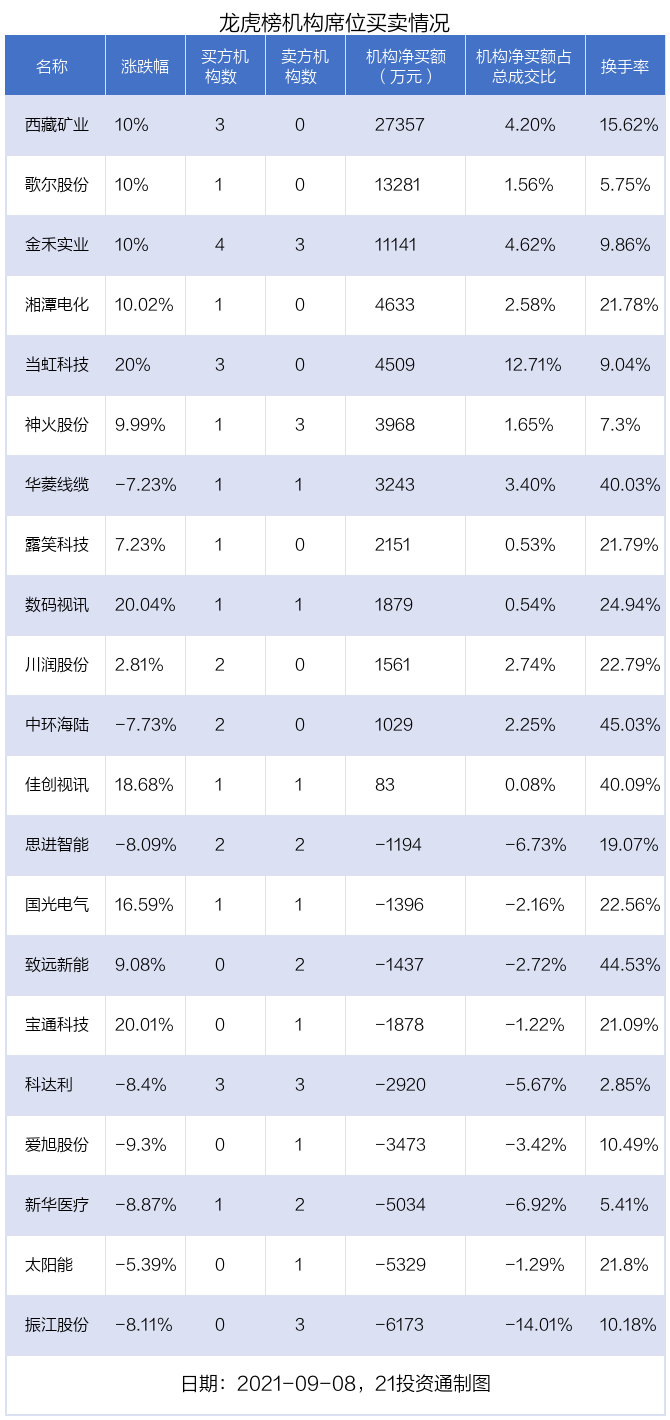 9月8日,21只个股龙虎榜出现了机构的身影,机构合计净买入4.6亿元。具体来看,机构净买入12股,净卖出9股。