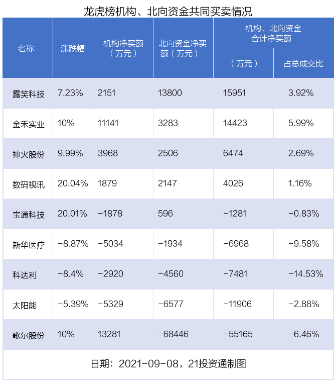 值得注意的是,机构和北向资金共同净买入了露笑科技、金禾实业、神火股份、数码视讯等4股;共同净卖出了新华医疗、科达利、太阳能等3股;在宝通科技、歌尔股份上出现分歧,机构净卖出宝通科技1877.68万元,北向资金净买入596.24万元;机构净买入歌尔股份1.33亿元,北向资金净卖出6.84亿元。