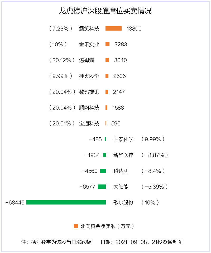 9月8日,北向资金参与龙虎榜中的个股共有12只,合计净卖出5.5亿元。其中沪股通净卖出1 股,合计净卖出1933.75万元;深股通净买入7 股,净卖出4 股,合计净卖出5.31亿元。