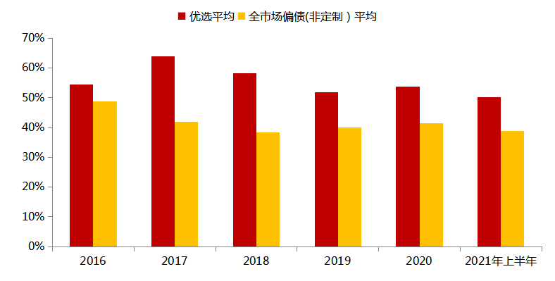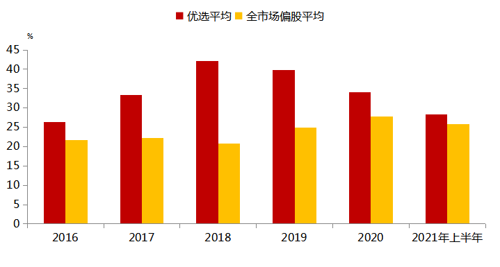 权益类公募优选与全市场偏股机构持有比例(2016-2021年上半年)