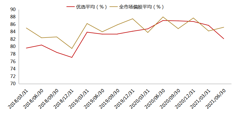 权益类公募优选及全市场仓位变化(2018Q1-2021Q2)