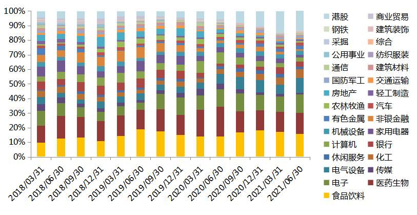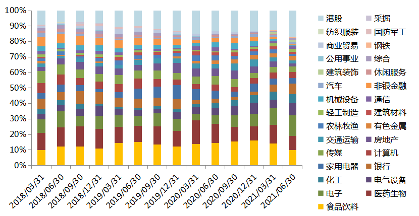 全市场权益类产品重仓股行业分布及变动(2018Q1-2021Q2)